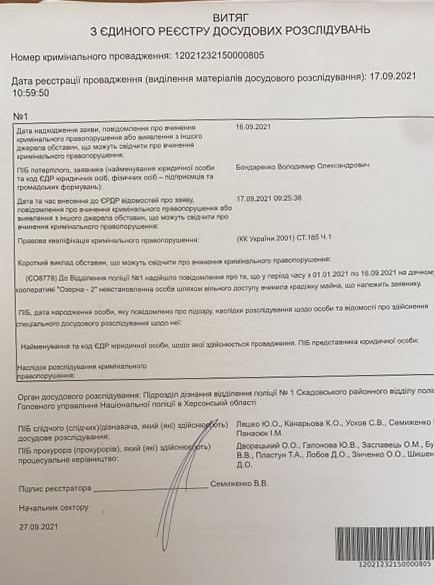 Більш уважними до мене виявилися в поліції Голопристанського району Херсонщини, на території якого і була розташована розібрана дача. Через годину патрульний екіпаж поліції усе ж приїхав на місце злочину. Увесь цей час я майже як вартовий ходив за головою кооперативу Олексієм Майданюком, який все збирався чкурнути від поліції, бо запахло смаженим. Адже саме він, як виявилося, майже три місяці підряд дозволяв демонтувати чужу йому дачу і весь цей час відкривав для зловмисника на спецтехніці Антона Саранчі ворота, завжди зачинені на замок.