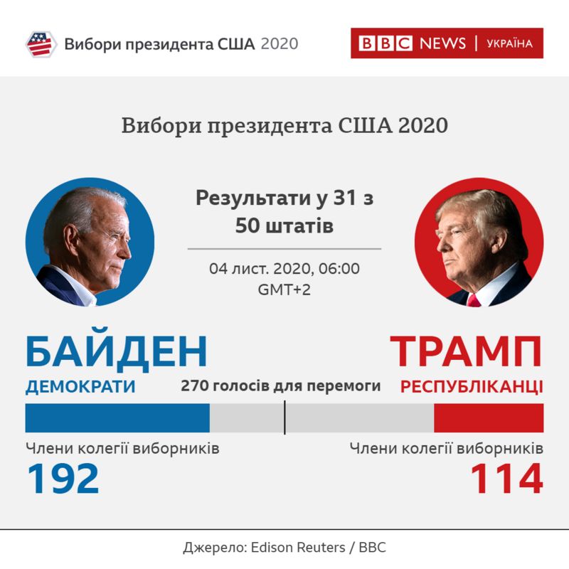 Станом на 6:00 за київським часом, відомі лідери у 31 з 50 штатів. Дональд Трамп має 114 голосів виборників, Джо Байден - 192 голоси.